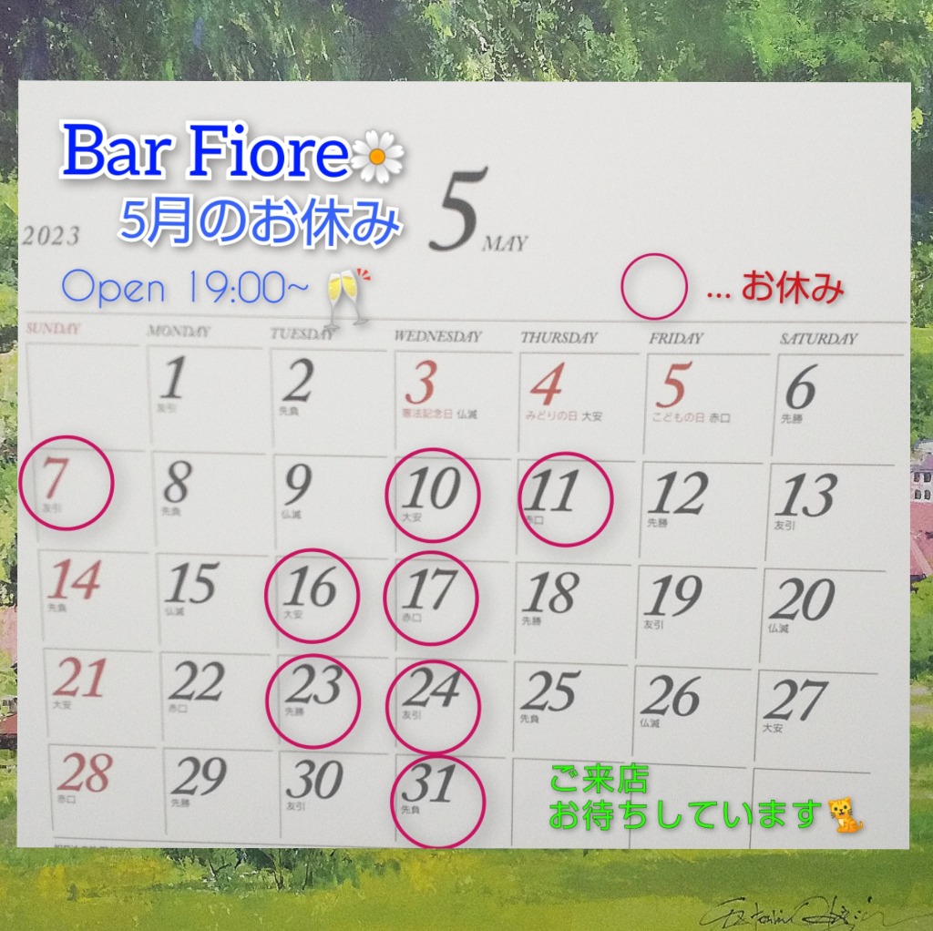 5月のお休みは GWは営業、7日お休みします。今月も2連休をとらせて頂きます。 大阪市東淀川区相川の隠れ家バー FIOREにお立ち寄りください!