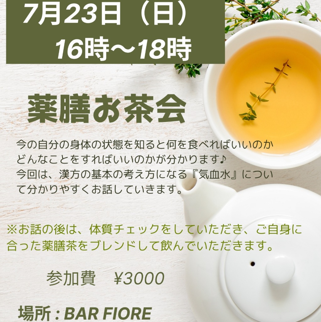 7/23(日)は 第2回目 薬膳お茶会…テーブルを囲んで ~身体に良いお話と薬膳茶を楽しみます。既に参加者は締め切りました😹有難うございます!